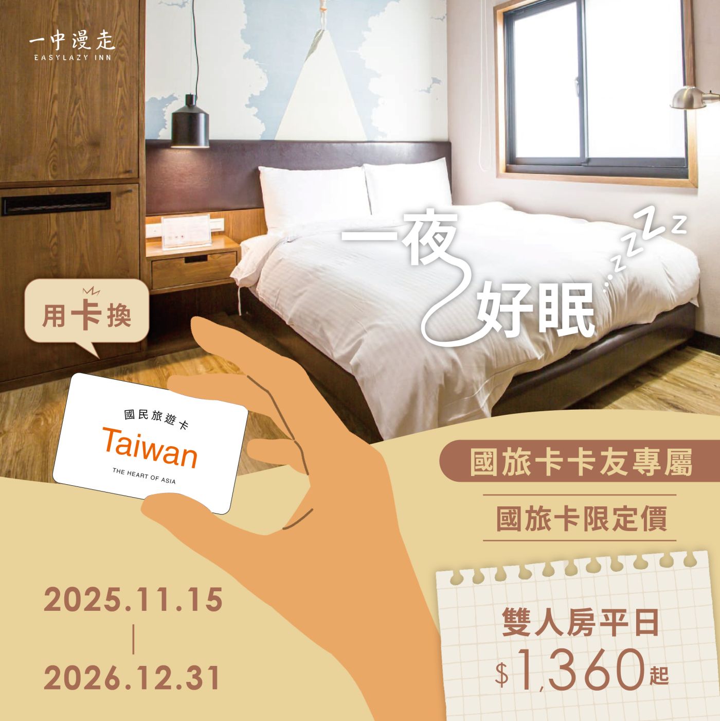 你的國旅卡,就是你最好的旅遊基金! 一中漫走推出國旅卡卡友專屬優惠, 雙人房平日只要 $1,360 起!